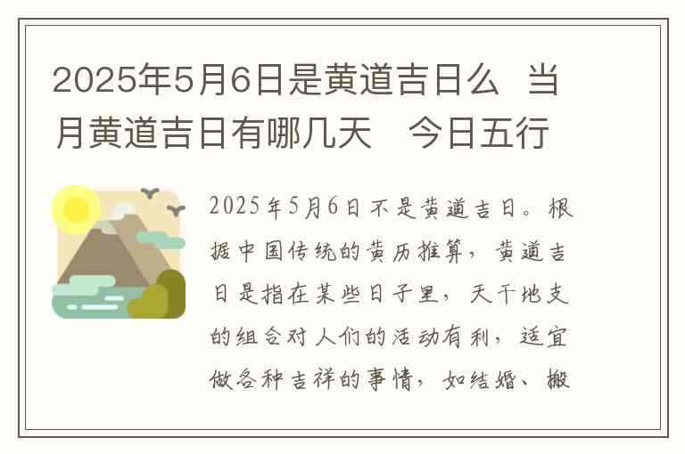 2025年5月6日不是黄道吉日。根据中国传统的黄历推算,黄道吉日是指在某些日子里,天干地支的组合对人们的活动有利,适宜做各种吉祥的事情,如结婚、搬家、开业等。而黄道吉日是由阴阳五行、天干地支的相生相克关系决定的。因此,每个月的黄道吉日并不固定,而是根据每一年的具体天文、地理、气候等情况来推算的。