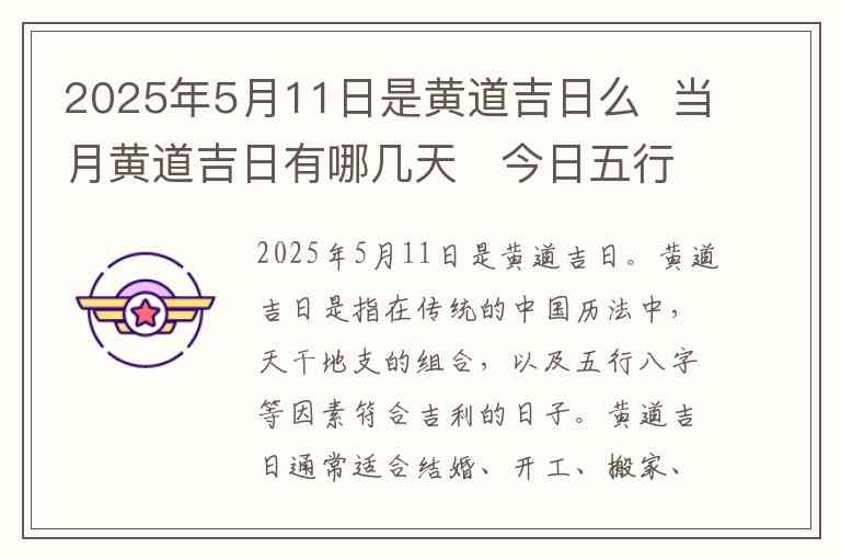 2025年5月11日是黄道吉日。黄道吉日是指在传统的中国历法中,天干地支的组合,以及五行八字等因素符合吉利的日子。黄道吉日通常适合结婚、开工、搬家、做生意等重要活动,因此,这一天被认为是一个有利的日子。