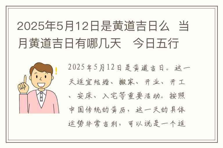 2025年5月12日是黄道吉日。这一天适宜结婚、搬家、开业、开工、安床、入宅等重要活动。按照中国传统的黄历,这一天的具体运势非常吉利,可以说是一个适合举行重大事件的好日子。