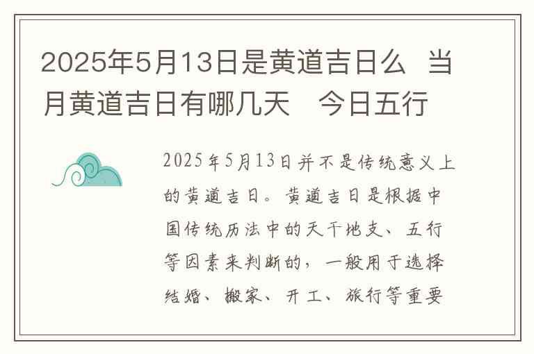 2025年5月13日并不是传统意义上的黄道吉日。黄道吉日是根据中国传统历法中的天干地支、五行等因素来判断的,一般用于选择结婚、搬家、开工、旅行等重要活动的吉时。对于2025年5月13日,根据日历和传统命理分析,这一天并没有特别的吉祥属性。