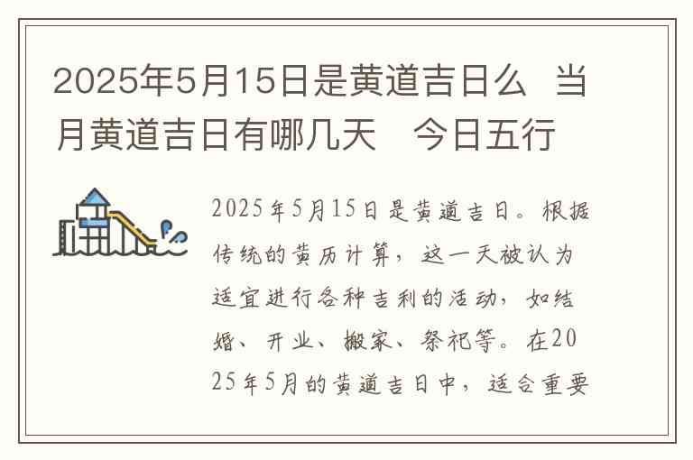 2025年5月15日是黄道吉日。根据传统的黄历计算,这一天被认为适宜进行各种吉利的活动,如结婚、开业、搬家、祭祀等。