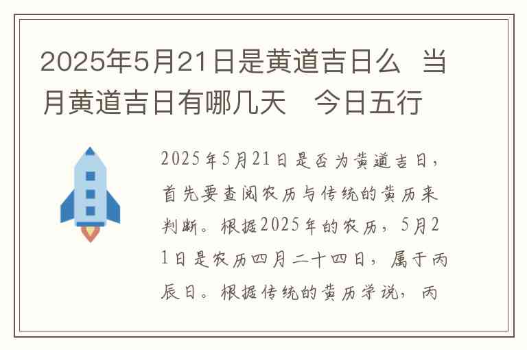 2025年5月21日是否为黄道吉日,首先要查阅农历与传统的黄历来判断。根据2025年的农历,5月21日是农历四月二十四日,属于丙辰日。根据传统的黄历学说,丙辰日通常是一个较为平稳的日子,但是否为黄道吉日还要考虑更多的因素,比如当天的天干地支配合、阴阳五行等。