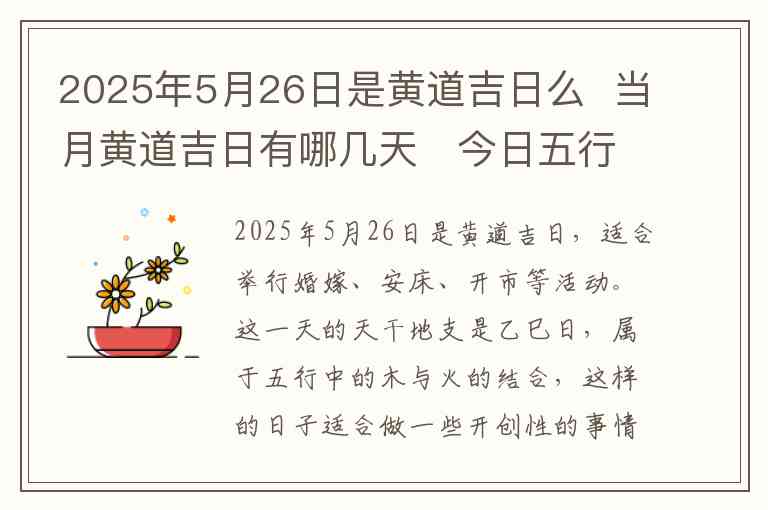 2025年5月26日是黄道吉日,适合举行婚嫁、安床、开市等活动。这一天的天干地支是乙巳日,属于五行中的木与火的结合,这样的日子适合做一些开创性的事情,充满活力和生机。