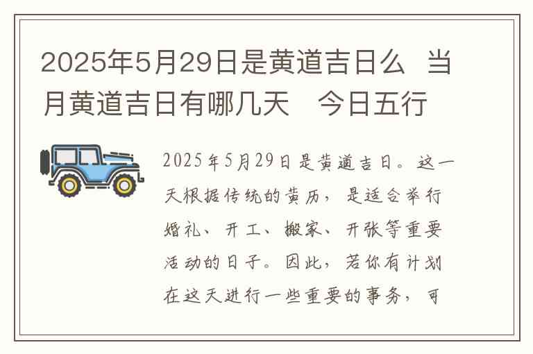 2025年5月29日是黄道吉日。这一天根据传统的黄历,是适合举行婚礼、开工、搬家、开张等重要活动的日子。因此,若你有计划在这天进行一些重要的事务,可以放心地参考这一吉日。