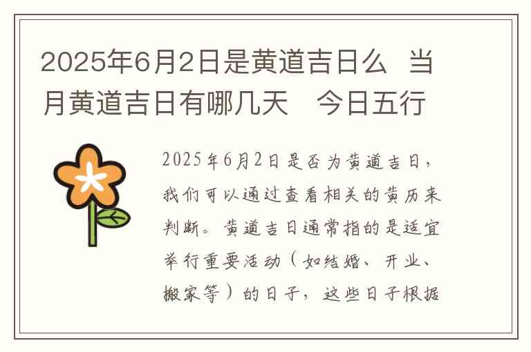 2025年6月2日是否为黄道吉日,我们可以通过查看相关的黄历来判断。黄道吉日通常指的是适宜举行重要活动(如结婚、开业、搬家等)的日子,这些日子根据天干地支、五行等因素来进行推算。