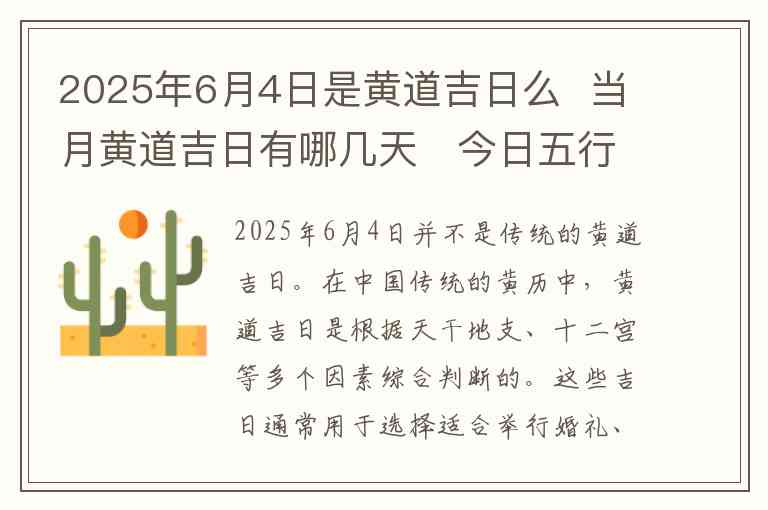 2025年6月4日并不是传统的黄道吉日。在中国传统的黄历中,黄道吉日是根据天干地支、十二宫等多个因素综合判断的。这些吉日通常用于选择适合举行婚礼、搬家、开业等活动的日期。2025年6月4日对应的是农历四月二十,虽然是一个普通的日子,并没有特别标示为吉日。