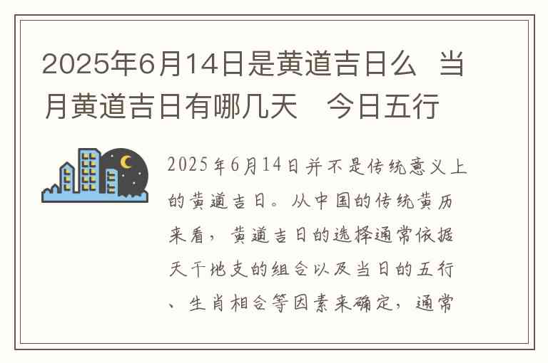 2025年6月14日并不是传统意义上的黄道吉日。从中国的传统黄历来看,黄道吉日的选择通常依据天干地支的组合以及当日的五行、生肖相合等因素来确定,通常是一些适合举行婚宴、开业、搬家等大事的日子。经过查询,2025年6月14日并不符合黄道吉日的标准。