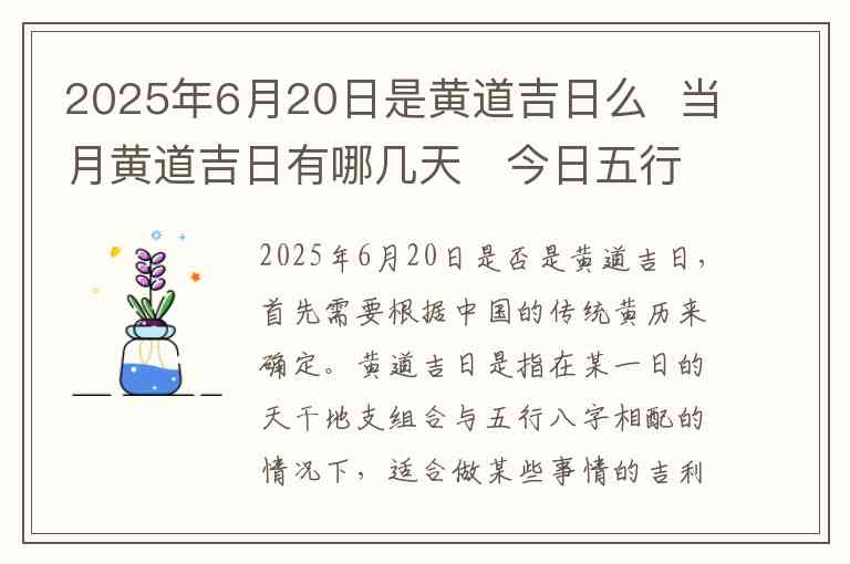2025年6月20日是否是黄道吉日,首先需要根据中国的传统黄历来确定。黄道吉日是指在某一日的天干地支组合与五行八字相配的情况下,适合做某些事情的吉利日子。经过查证,2025年6月20日是属于黄道吉日,因此,这一天适宜进行结婚、开业、搬家、安床等活动,比较合适用于这些需要择吉的事情。
