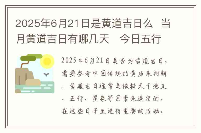 2025年6月21日是否为黄道吉日,需要参考中国传统的黄历来判断。黄道吉日通常是依据天干地支、五行、星象等因素来选定的,在这些日子里进行重要的活动,通常认为能得到较好的运势。根据2025年的黄历,6月21日(农历五月十四)确实是一个黄道吉日,适合结婚、搬家、开业等各种重要事务。