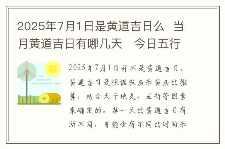 2025年7月1日并不是黄道吉日。黄道吉日是根据农历和黄历的推算,结合天干地支、五行等因素来确定的。每一天的黄道吉日有所不同,可能会有不同的时间和日期,这通常需要参考具体的黄历来确定。