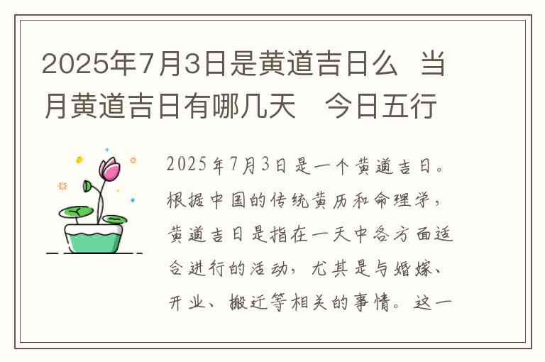 2025年7月3日是一个黄道吉日。根据中国的传统黄历和命理学,黄道吉日是指在一天中各方面适合进行的活动,尤其是与婚嫁、开业、搬迁等相关的事情。这一天的黄道吉日标志着适合举行重要仪式和活动,意味着当日吉祥如意,容易获得好运。