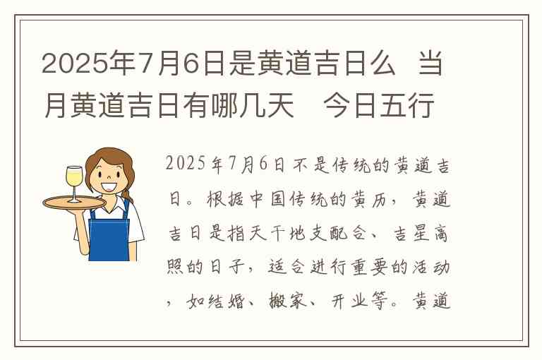 2025年7月6日不是传统的黄道吉日。根据中国传统的黄历,黄道吉日是指天干地支配合、吉星高照的日子,适合进行重要的活动,如结婚、搬家、开业等。黄道吉日通常会结合日柱、月柱、时辰等因素来推算,依据传统的阴阳五行学说和天文学原理。