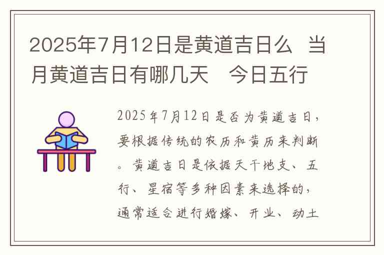 2025年7月12日是否为黄道吉日,要根据传统的农历和黄历来判断。黄道吉日是依据天干地支、五行、星宿等多种因素来选择的,通常适合进行婚嫁、开业、动土、安葬等吉利的活动。通过查看黄历可以得知,2025年7月12日属于农历六月二十日。这一天的黄历信息通常会提到适宜与不适宜做的事情,可以参考当地的黄历来确认是否适合进行重大决策或活动。