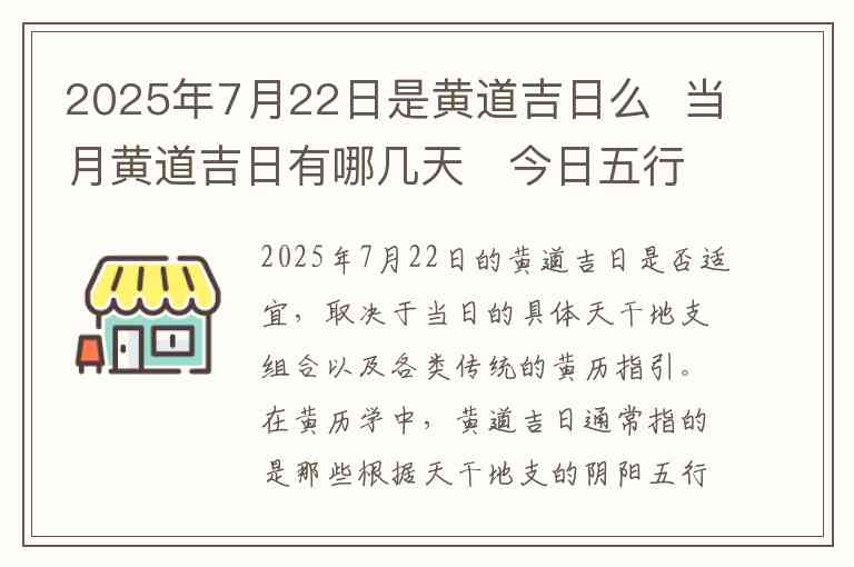 2025年7月22日的黄道吉日是否适宜,取决于当日的具体天干地支组合以及各类传统的黄历指引。在黄历学中,黄道吉日通常指的是那些根据天干地支的阴阳五行、星曜运行等因素,被认为最为吉利、适合举行各种活动的日子。为了确定2025年7月22日是否为黄道吉日,需要查阅专门的黄历,综合多方面的因素进行判断。