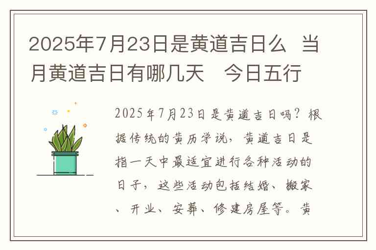 2025年7月23日是黄道吉日吗?根据传统的黄历学说,黄道吉日是指一天中最适宜进行各种活动的日子,这些活动包括结婚、搬家、开业、安葬、修建房屋等。黄道吉日和五行八字等因素密切相关,并且会根据具体年份、月份、日子的干支五行来推算。