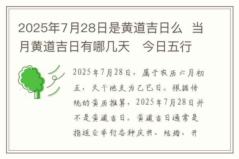 2025年7月28日,属于农历六月初五,天干地支为乙巳日。根据传统的黄历推算,2025年7月28日并不是黄道吉日。黄道吉日通常是指适合举行各种庆典、结婚、开业、搬家等活动的吉祥日子,具有较好的五行、天时等条件,而2025年7月28日的黄历指出这一天的五行可能并不特别吉利。
