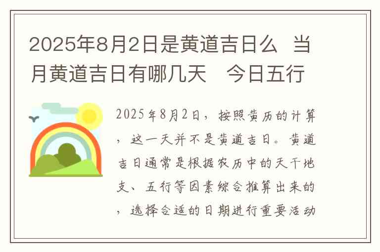 2025年8月2日,按照黄历的计算,这一天并不是黄道吉日。黄道吉日通常是根据农历中的天干地支、五行等因素综合推算出来的,选择合适的日期进行重要活动或开业等事务。在2025年8月2日这一日,并不符合黄道吉日的条件。