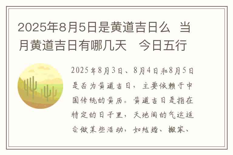 2025年8月5日是黄道吉日,和8月3日一样,适合各种吉利的事务进行,比如结婚、装修、出行等。是个值得把握的良好时机。