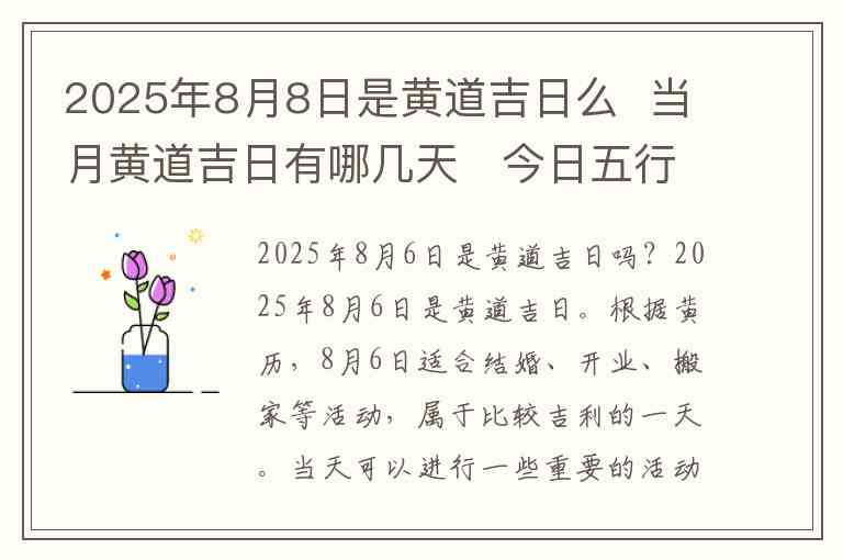 2025年8月8日是黄道吉日。这一天被认为是一个适合举行重大仪式和活动的好日子。例如,结婚、开业、搬家等重要事务可以选择在这一天进行。整体来看,8月8日是个吉祥的日子,适合开始新的计划和行动。