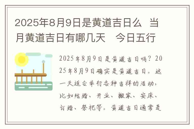 2025年8月9日确实是黄道吉日。这一天适合举行各种吉祥的活动,比如结婚、开业、搬家、安床、订婚、祭祀等。黄道吉日通常是根据中国传统的天文、命理、风水学进行推算的,选择这些日子进行重要活动,有助于带来好运与顺利。