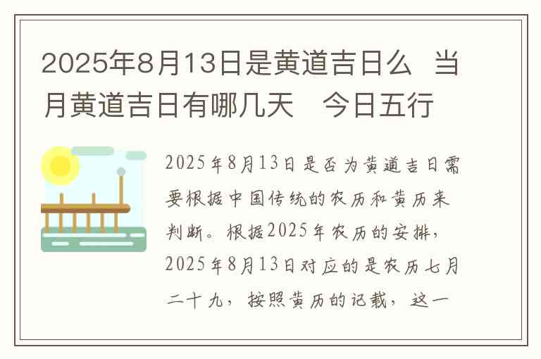 2025年8月13日是否为黄道吉日需要根据中国传统的农历和黄历来判断。根据2025年农历的安排,2025年8月13日对应的是农历七月二十九,按照黄历的记载,这一天并不是黄道吉日。