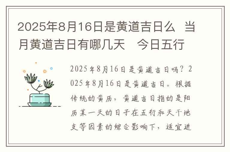2025年8月16日是黄道吉日。根据传统的黄历,黄道吉日指的是阳历某一天的日子在五行和天干地支等因素的综合影响下,适宜进行婚嫁、开业、搬家、祭祀等各种活动的吉利日子。每个黄道吉日通常与吉时和吉方相关,依据五行八字等元素来推算其是否适合进行某些重大事务。