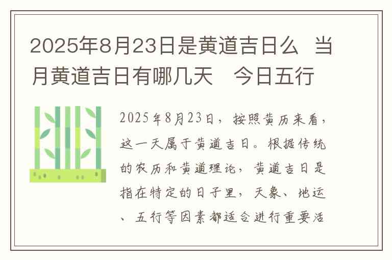 2025年8月23日,按照黄历来看,这一天属于黄道吉日。根据传统的农历和黄道理论,黄道吉日是指在特定的日子里,天象、地运、五行等因素都适合进行重要活动,如结婚、搬家、开业、订婚等。因此,2025年8月23日是一个宜进行这些事情的好日子。