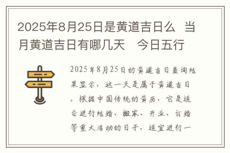 2025年8月25日的黄道吉日查询结果显示,这一天是属于黄道吉日。根据中国传统的黄历,它是适合进行结婚、搬家、开业、订婚等重大活动的日子,适宜进行一切大吉大利的事务。