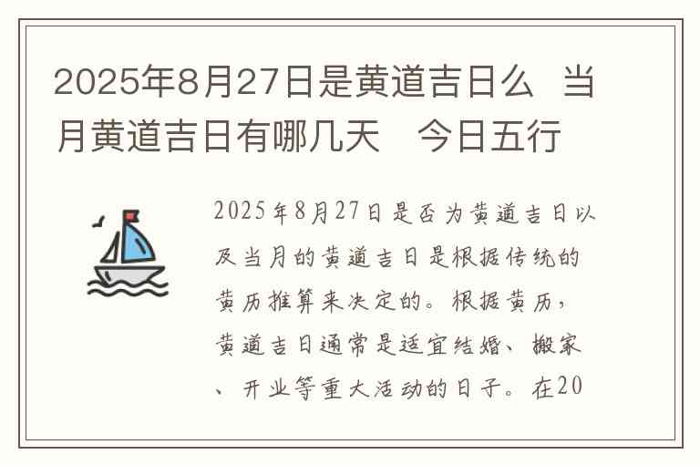 2025年8月27日是否为黄道吉日以及当月的黄道吉日是根据传统的黄历推算来决定的。根据黄历,黄道吉日通常是适宜结婚、搬家、开业等重大活动的日子。在2025年8月的黄历中,8月27日并不列为黄道吉日。