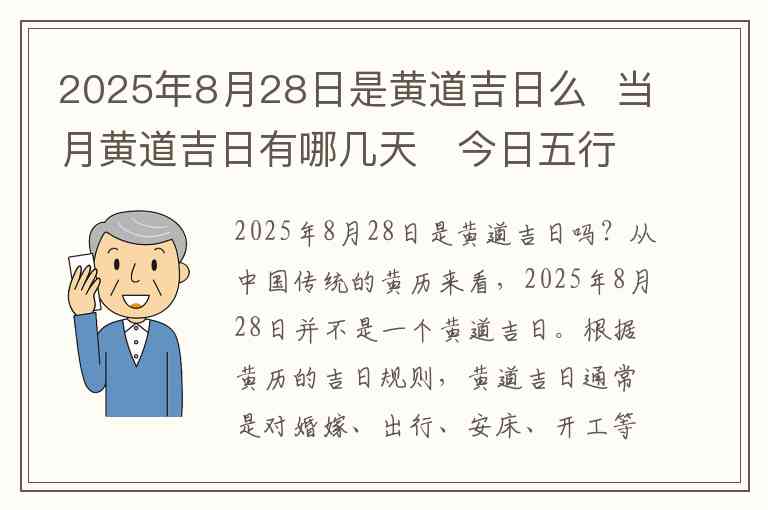 从中国传统的黄历来看,2025年8月28日并不是一个黄道吉日。根据黄历的吉日规则,黄道吉日通常是对婚嫁、出行、安床、开工等事项较为吉利的日子,而8月28日这一日的具体情况并不在“宜”类的吉日中。如果你计划进行一些特别的活动,可能需要选择其他的日子。