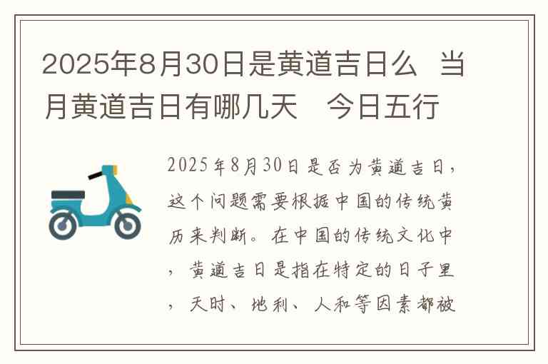2025年8月30日是否为黄道吉日,这个问题需要根据中国的传统黄历来判断。在中国的传统文化中,黄道吉日是指在特定的日子里,天时、地利、人和等因素都被认为是适宜进行重要活动的日子,如结婚、开业、搬家、修建等。通常这类日子都会特别标注为“吉日”。