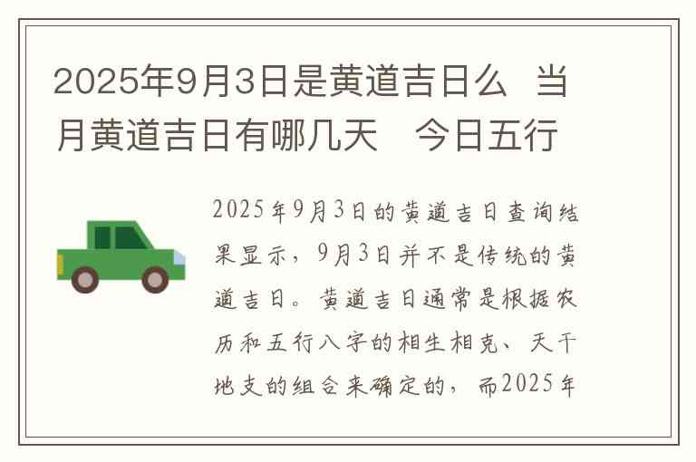2025年9月3日的黄道吉日查询结果显示,9月3日并不是传统的黄道吉日。黄道吉日通常是根据农历和五行八字的相生相克、天干地支的组合来确定的,而2025年9月3日(农历七月二十日)并不符合这些条件。