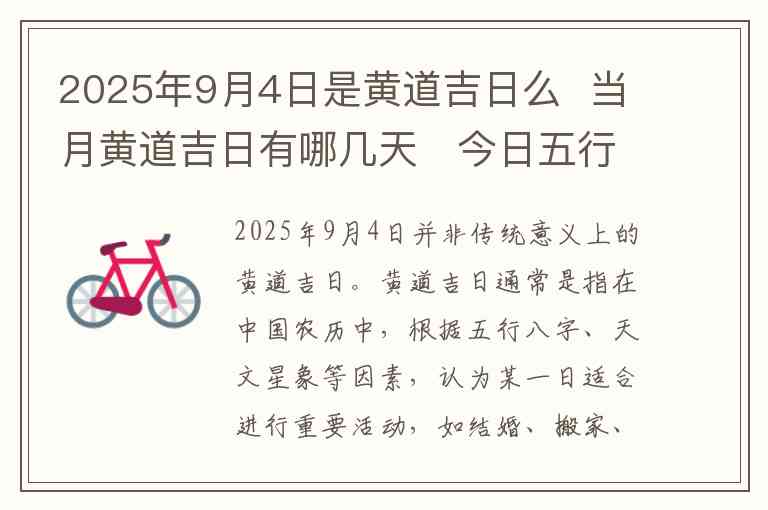 2025年9月4日并非传统意义上的黄道吉日。黄道吉日通常是指在中国农历中,根据五行八字、天文星象等因素,认为某一日适合进行重要活动,如结婚、搬家、开工等。要判断一日是否为黄道吉日,需要查阅当年的黄历或择日书。