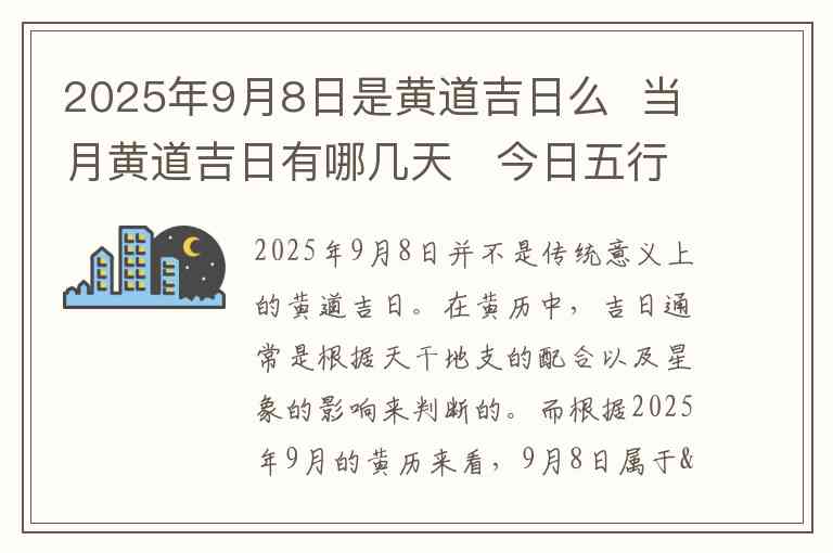 2025年9月8日并不是传统意义上的黄道吉日。在黄历中,吉日通常是根据天干地支的配合以及星象的影响来判断的。而根据2025年9月的黄历来看,9月8日属于“破日”,此日不宜举行重要活动,如结婚、开业、搬家等,因为“破”字带有不吉利的含义。
