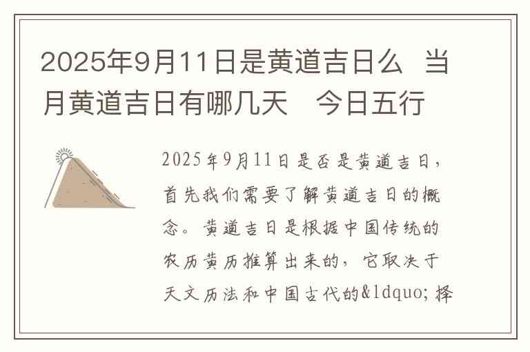2025年9月11日是否是黄道吉日,首先我们需要了解黄道吉日的概念。黄道吉日是根据中国传统的农历黄历推算出来的,它取决于天文历法和中国古代的“择日”理论,旨在选择适合做重要事情的日子。通常,黄道吉日用于结婚、开工、搬家等活动。对于2025年9月11日,它是否为黄道吉日需要查看当时的黄历,但通常这个日期如果没有特殊的禁忌标注,那么它可能是黄道吉日之一。