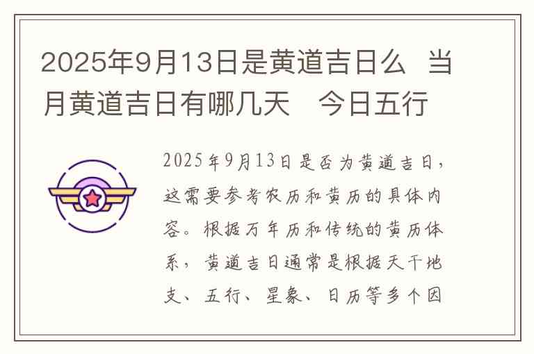 2025年9月13日是否为黄道吉日,这需要参考农历和黄历的具体内容。根据万年历和传统的黄历体系,黄道吉日通常是根据天干地支、五行、星象、日历等多个因素综合考虑的日期。若要确认2025年9月13日是否是黄道吉日,需要查阅当年当月的黄历,通常会标明哪些日子适合做大事、结婚、开业、搬家等。