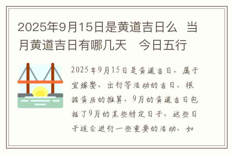 2025年9月15日是黄道吉日,属于宜嫁娶、出行等活动的吉日。根据黄历的推算,9月的黄道吉日包括了9月的某些特定日子,这些日子适合进行一些重要的活动,如结婚、搬家、开业等。