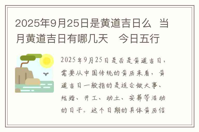 2025年9月25日是否是黄道吉日,需要从中国传统的黄历来看,黄道吉日一般指的是适合做大事、结婚、开工、动土、安葬等活动的日子。这个日期的具体黄历信息会根据当年的农历推算出来。