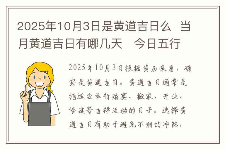 2025年10月3日根据黄历来看,确实是黄道吉日。黄道吉日通常是指适合举行婚宴、搬家、开业、修建等吉祥活动的日子。选择黄道吉日有助于避免不利的冲煞,增添好运。