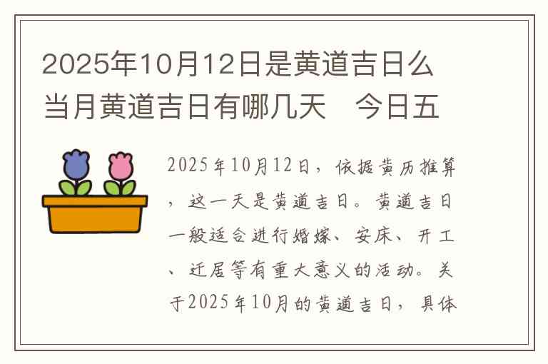 2025年10月12日,依据黄历推算,这一天是黄道吉日。黄道吉日一般适合进行婚嫁、安床、开工、迁居等有重大意义的活动。