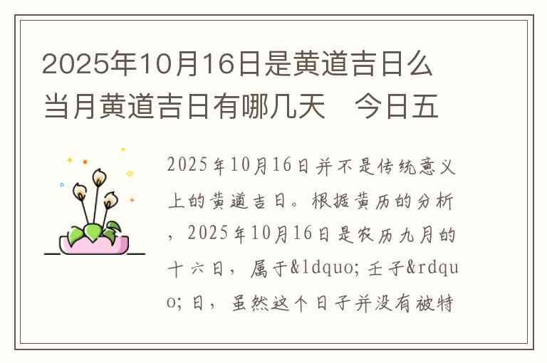 2025年10月16日并不是传统意义上的黄道吉日。根据黄历的分析,2025年10月16日是农历九月的十六日,属于“壬子”日,虽然这个日子并没有被特别标记为黄道吉日,但在一些日常的活动中还是可以进行普通的事务。黄道吉日通常是指适合举行婚礼、安床、搬家等重要活动的日子,依据日柱和天干地支的配合来推测。
