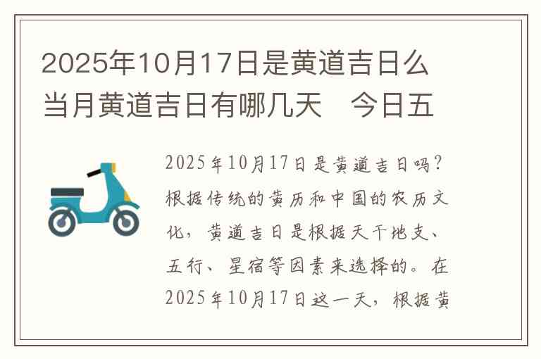 根据传统的黄历和中国的农历文化,黄道吉日是根据天干地支、五行、星宿等因素来选择的。在2025年10月17日这一天,根据黄历的推算,这一天是“黄道吉日”,适合进行许多传统的活动,如结婚、开业、搬家、开工、求子等。