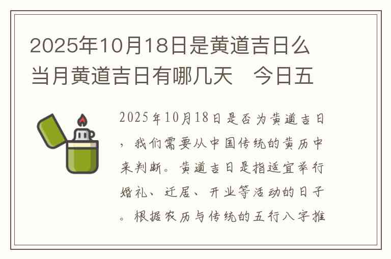 2025年10月18日是否为黄道吉日,我们需要从中国传统的黄历中来判断。黄道吉日是指适宜举行婚礼、迁居、开业等活动的日子。根据农历与传统的五行八字推算,2025年10月18日(农历九月初八)是一个吉日,适合一些重要的活动,但也有一些禁忌,需要根据具体的个人八字来选择合适的时辰。