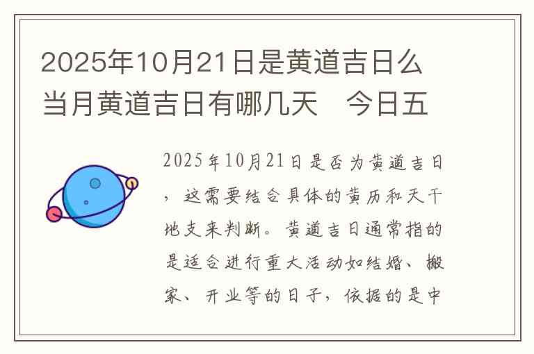2025年10月21日是否为黄道吉日,这需要结合具体的黄历和天干地支来判断。黄道吉日通常指的是适合进行重大活动如结婚、搬家、开业等的日子,依据的是中国传统的阴阳五行与天干地支的配合。