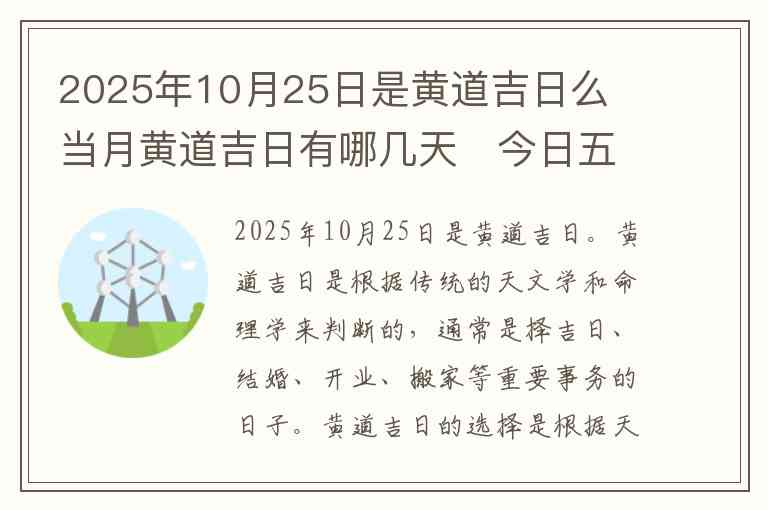 2025年10月25日是黄道吉日。黄道吉日是根据传统的天文学和命理学来判断的,通常是择吉日、结婚、开业、搬家等重要事务的日子。黄道吉日的选择是根据天干地支、五行八字等因素来推算的,而10月25日的这一日期符合吉利的条件,因此是黄道吉日。