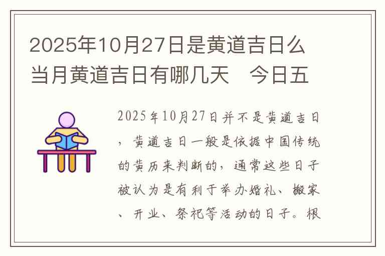2025年10月27日并不是黄道吉日,黄道吉日一般是依据中国传统的黄历来判断的,通常这些日子被认为是有利于举办婚礼、搬家、开业、祭祀等活动的日子。根据黄历,2025年10月27日这一天的运势较为平常,不属于黄道吉日。