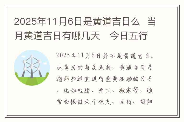 2025年11月6日并不是黄道吉日。从黄历的角度来看,黄道吉日是指那些适宜进行重要活动的日子,比如结婚、开工、搬家等,通常会根据天干地支、五行、阴阳等因素来决定。而2025年11月6日的天干地支组合并不符合黄道吉日的标准。