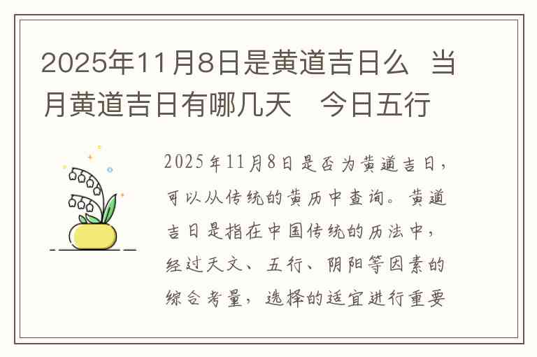 2025年11月8日是否为黄道吉日,可以从传统的黄历中查询。黄道吉日是指在中国传统的历法中,经过天文、五行、阴阳等因素的综合考量,选择的适宜进行重要活动的日子。根据2025年11月的黄历,11月8日被视为适合进行大多数有吉利意义的活动的一天,因此可以认为它是黄道吉日之一。