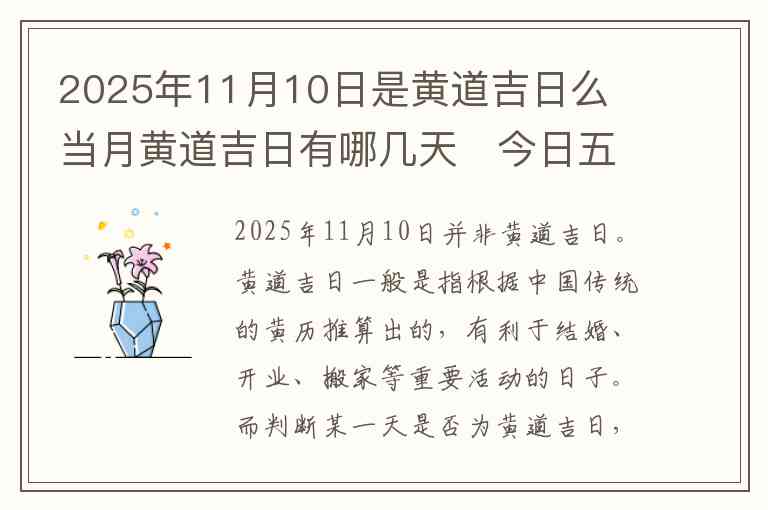 2025年11月10日并非黄道吉日。黄道吉日一般是指根据中国传统的黄历推算出的,有利于结婚、开业、搬家等重要活动的日子。而判断某一天是否为黄道吉日,通常需要参考天干地支、五行、生肖、以及具体的农历和节气等因素。