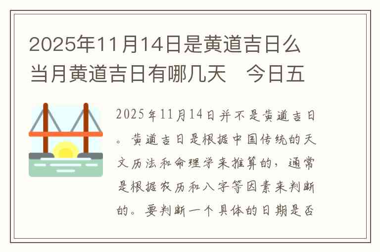 2025年11月14日并不是黄道吉日。黄道吉日是根据中国传统的天文历法和命理学来推算的,通常是根据农历和八字等因素来判断的。要判断一个具体的日期是否为黄道吉日,需结合农历、天干地支、五行等多重因素。